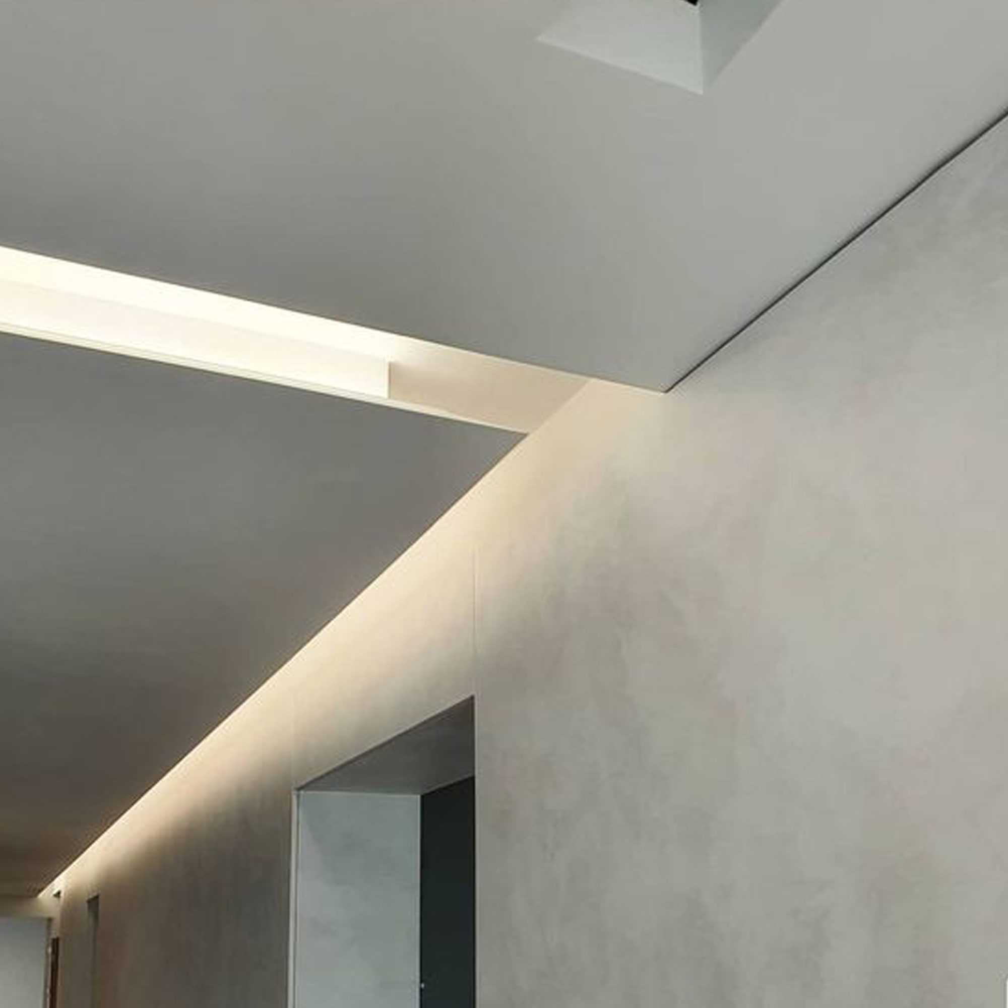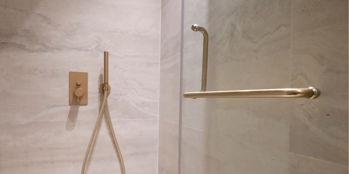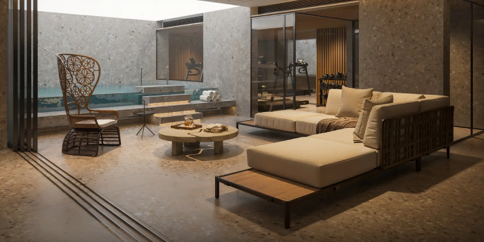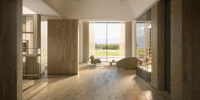 The interior palette is anchored by Travertine Beige and Brass, used throughout in complementary textures that convey warmth and depth. These are paired with Ceppo di Gré and Gunmetal, bringing contrast and a contemporary edge. The result is a balanced material composition that defines the identity of The 971 Collection.